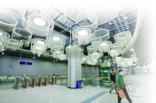 十号线二期机场跑道旧址站,通过动感曲线造型嵌入式灯光系统,塑造出动感与未来感的立体空间。