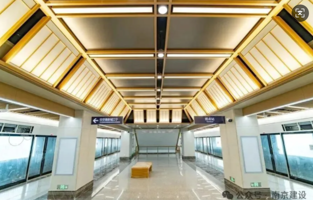 6号线自既有车站南京南站出发,终至栖霞山站,线路贯通栖霞、玄武、秦淮、雨花,依次穿越新港开发区、紫金山、中心城区和南部新城等重要区域。全线总长约32.35公里,共新设车站19座,其中包括7座换乘站,是换乘枢纽密集的骨干线路。其中,栖霞山站以“鎏金书卷”为设计灵感,通过仰角的装饰铝板搭配琥珀色LED线条灯,结合枫叶艺术装置与仿古红墙元素,呼应栖霞山自然特色。金陵石化站则以工业记忆为核心,将彩色管道艺术化重构,打造南京首座“工业风”主题地铁车站。