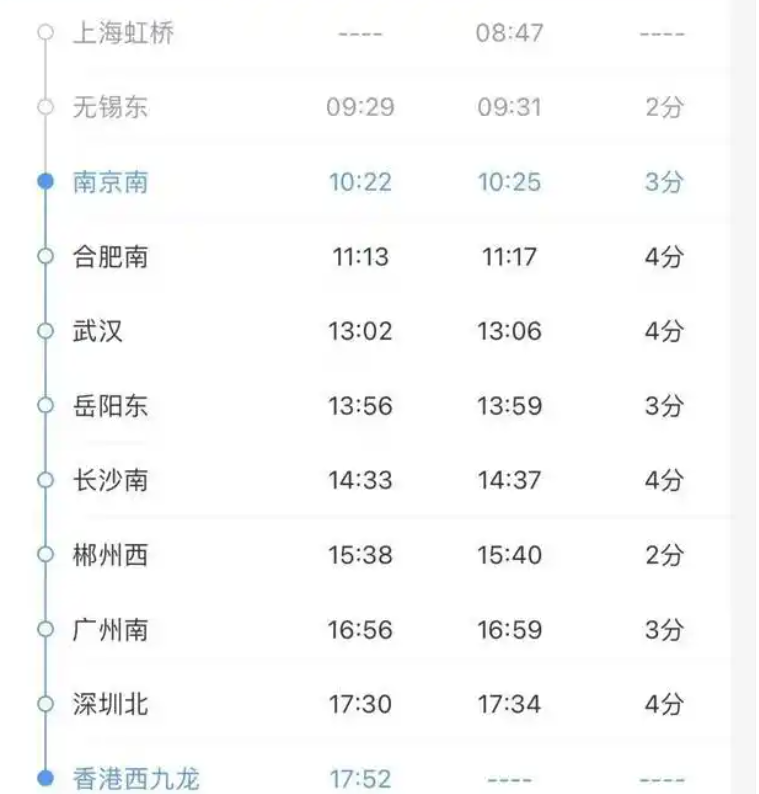 根据12306平台信息,G385次列车由上海虹桥站始发,10:22 抵达南京南站,10:25 从南京南站出发,17:52 抵达香港西九龙站,“朝发夕至”的时刻安排极大提升了旅客的出行便利性;返程G386次列车,14:05 从香港西九龙站出发,21:10 抵达南京南站,全程耗时7小时05分。