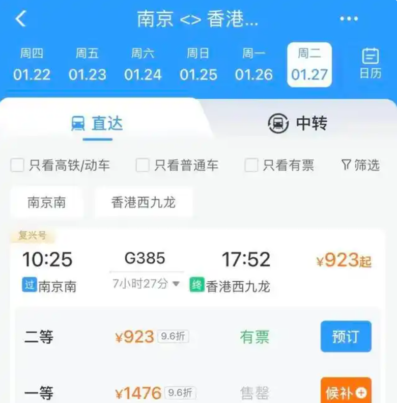 票价方面实行动态折扣政策。记者在12306平台上看到,南京南至香港西九龙二等座为923元,一等座与商务座折扣后价格分别为1476元、2844元。票务信息一经上线便引发抢票热潮:香港返程票开售当日下午,商务座即显示“候补”状态,一等座余票仅剩个位数,二等座虽余票充足但查询量持续激增;南京出发票开售仅3小时,1月27日首趟列车的商务座、一等座已售罄,二等座成为购票主力,余票实时递减。