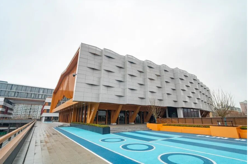 拾级而上,一栋外立面采用白色穿孔铝板打造出折线造型的现代化建筑映入眼帘,这便是风雨操场与食堂建筑,这也是江苏省近零能耗建筑示范。其中风雨操场采用钢木结构,大跨度屋面运用预应力张弦梁技术,目前已获得中国建筑节能协会颁发的近零能耗建筑认证。